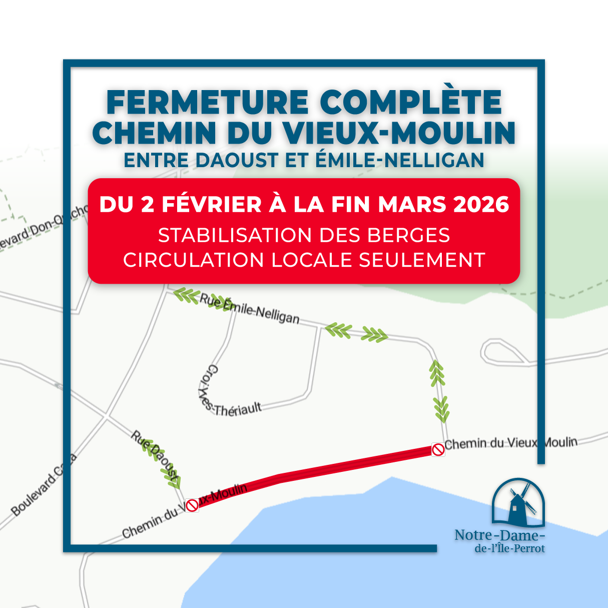 La Ville de Notre-Dame-de-l’Île-Perrot souhaite vous informer de la fermeture complète du chemin du Vieux-Moulin (entre les rues Émile-Nelligan et Daoust) du 2 février à la fin du mois de mars 2026. La fermeture est requise pendant la réalisation du projet de stabilisation des berges dans ce secteur.